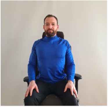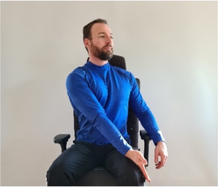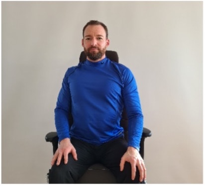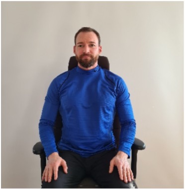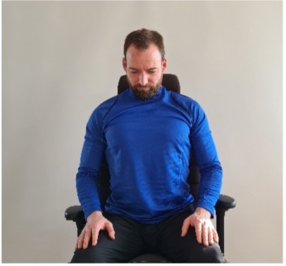 Die Hände liegen auf den Oberschenkeln, die Schultern sind entspannt