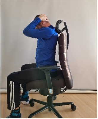 Übe anschließend Druck auf den Hinterkopf aus und ziehe das Kinn dadurch Richtung Brust