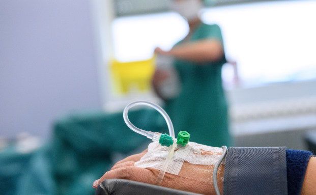 Die Hand einer Patientin mit einem periphervenösen Zugang ist während der Operation am OP-Tisch fixiert.