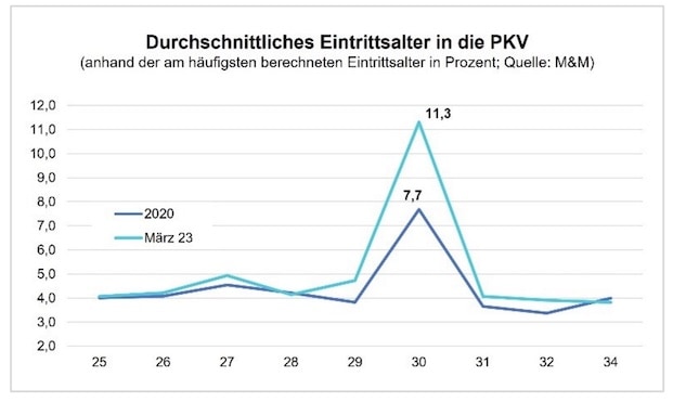 Eine erste Erkenntnis, die JDC aus den Datensätzen zieht, lautet, dass das Eintrittsalter in der PKV markant gestiegen sei: Demnach sind 2020 noch 7,7 Prozent aller Tarifberechnungen für ein Eintrittsalter von 30 Jahren durchgeführt worden – dieser Anteil kletterte bis März 2023 auf 11,3 Prozent (siehe erste Grafik). „Dadurch erhöhte sich das durchschnittliche Eintrittsalter in die PKV von 29,7 Jahren (2020) auf 31,4 Jahren (März 2023)“, wie die Autoren mitteilen.