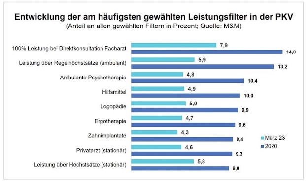 Außerdem kommt das Trendbarometer zu der Erkenntnis, dass auch die PKV-Versicherten aufs Geld schauten. So ging die Wahl der bislang beliebtesten Leistungsfilter seit 2020 zum Teil kräftig zurück (siehe erste Grafik auf dieser Seite). Leistungsfilter ermöglichten es, PKV-Anbieter zu finden, die den Absicherungswünschen der Kunden in bestimmten Bereichen am besten entsprechen, erklärt JDC. Damit verbunden seien aber unter Umständen auch höhere Prämien. Die Experten führen diese Entwicklung maßgeblich auf den Beobachtungszeitraum von 2020 bis März 2023 zurück. „Immerhin fielen die Corona-Pandemie, die Energiekrise und die kräftig steigenden Lebenshaltungskosten in diese Zeit“, so die Erklärung.