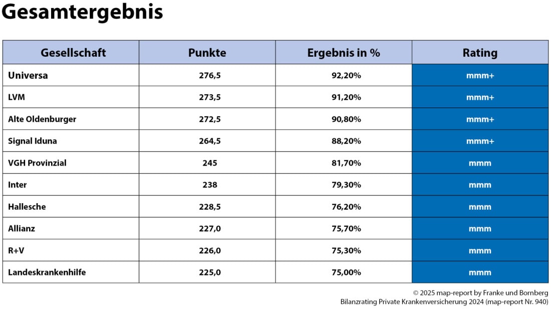 Wie schon erwähnt, schaffte es die Universa erstmals auf das Siegerpodest. Mit 276,5 (92,2 Prozent) von insgesamt 300 Punkten präsentiert sie sich als bilanzstärkster privater Krankversicherer Deutschlands.