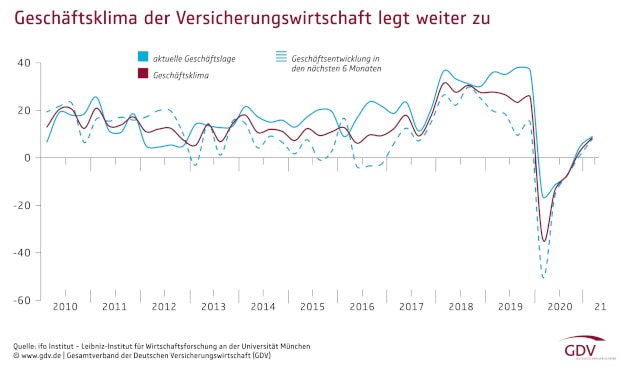 Nach dem Corona-bedingten Konjunktureinbruch im Vorjahr macht sich in der Assekuranz allmählich wieder Optimismus breit. Die Firmenchefs bewerten sowohl die aktuelle Lage als auch die Aussichten für die kommenden Monate deutlich positiver als noch im Schlussquartal 2020. Das berichtet der Gesamtverband der Deutschen Versicherungswirtschaft (GDV) unter Berufung auf den aktuellen Ifo-Konjunkturtest für die Versicherungswirtschaft. Danach stieg der Teilindex zur Geschäftslage im Frühjahr um 4,3 auf 8,9 Punkte, der für die Geschäftsaussichten legte gar um 6,9 auf 7,8 Punkte zu.