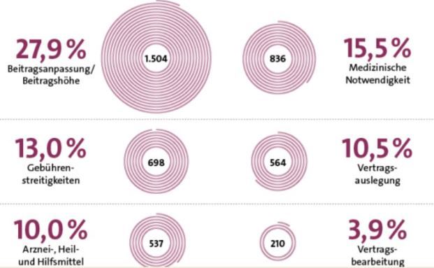 Direkt dahinter auf Platz zwei finden sich Streitigkeiten zu den medizinischen Notwendigkeiten, 15,5 Prozent aller Fälle gehen darauf zurück. Der Wert habe sich in den vergangenen Jahren nahezu nicht verändert. Hier geht es insbesondere um die Erstattungsfähigkeit von Heilbehandlungen und Krankenhausaufenthalten sowie Beschwerden im Zusammenhang mit Arzneimitteln sowie Heil- und Hilfsmitteln. Die medizinische Notwendigkeit kann nur am Einzelfall geklärt werden. Ein Grund für die häufige Nichtübernahme der Kosten mag, laut Ombudsmann, darin liegen, dass „die Versicherer eingereichte Rechnungen aufgrund des Kostendrucks im Gesundheitswesen insgesamt kritischer prüfen und immer häufiger über die Frage der medizinischen Notwendigkeit diskutiert werden muss.“