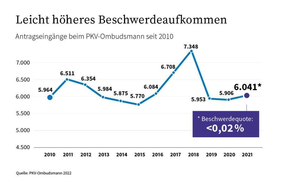 Der Ombudsmann für Private Krankenversicherungen (PKV) verzeichnete im abgelaufenen Jahr 6.041 Schlichtungsanträge. Das meldet der Verband der Privaten Krankenversicherung und bezieht sich dabei auf den Bericht seines Ombudsmannes Heinz Lanfermann. Demnach liege die Beschwerdequote, gemessen an insgesamt 46 Millionen Verträgen für Kranken-, Zusatz- und Pflegeversicherung bei gerade mal 0,2 Promille.