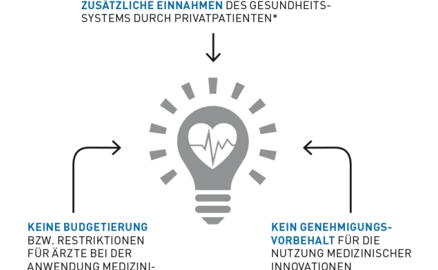 Im Gegensatz zur Gesetzlichen Krankenversicherung gibt es in der PKV geringere Genehmigungsvorbehalte bei Innovationen und niedrige Budgetgrenzen für die Ärzte. Und auch die Mehreinnahmen durch Privatpatienten können genutzt werden, um in medizinische Innovationen für alle zu investieren. Die Infografik gibt einen Überblick.
