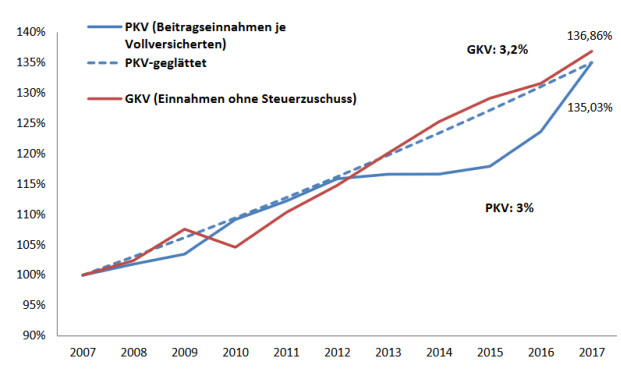 Herbe Beitragsanpassungen gibt es nur in der privaten Krankenversicherung? Von wegen. Auch die Krankenkassen langen kräftig zu. Wie eine Analyse des Wissenschaftlichen Instituts der PKV (WIP) zeigt, liegt der durchschnittliche Anstieg seit 2007 bei 3,0 Prozent in der PKV und bei 3,2 Prozent in der GKV.