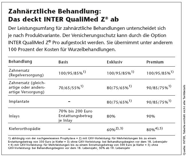 Gesetzlich Krankenversicherte greifen immer häufiger zu privaten Ergänzungslösungen: „Fast jeder dritte Deutsche hat seinen Versicherungsschutz bereits aufgestockt – Tendenz steigend. Bei unserer Produktreihe Inter QualiMed Z konnten wir die Abschlüsse deutlich steigern“, so Vertriebsvorstand Schillinger. Wie das Vollversicherungsprodukt Inter QualiMed wird auch die Zusatzversicherung in den Varianten Basis, Exklusiv und Premium angeboten, eine Gesundheitsprüfung entfällt dabei in der Basisstufe. Bei der Zahnbehandlung (siehe Tabelle) haben Kunden so die Möglichkeit, ein maßgeschneidertes Zusatzpaket zu wählen.