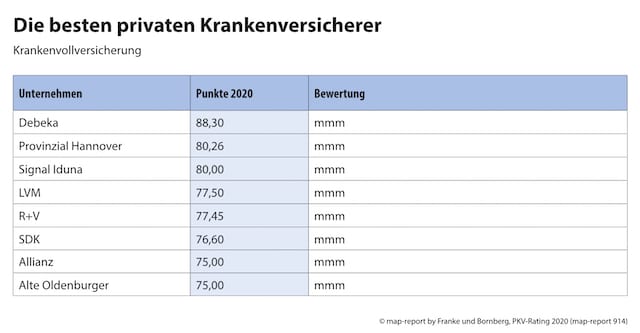 Die Krankenversicherer Signal Iduna, LVM, R+V, Allianz und Alte Oldenburger haben ebenfalls erneut ihren Platz in der Spitzengruppe behauptet. Wieder in der Riege der am besten bewerteten Anbieter ist die SDK.