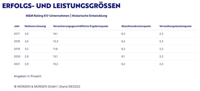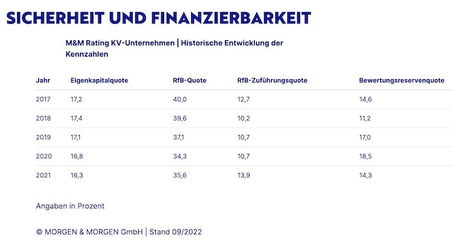 Die Leistungskennzahlen haben sich laut Morgen & Morgen 2021 solide entwickelt. Nachdem die Nettoverzinsung im Vorjahr einen Tiefststand mit 2,8 Prozent erreicht hatte, erholte sie sich nun mit einem Anstieg auf 2,9 Prozent leicht. Die versicherungsgeschäftliche Ergebnisquote habe sich sprunghaft auf einen neuen Fünf-Jahres-Höchstwert von 15,2 Prozent verbessert. Nahezu konstant seien Abschlusskosten- und Verwaltungskostenquote geblieben: Während die Kosten für Abschlüsse sich bei 6,2 Prozent einpendeln, bleibt die Verwaltungskostenquote mit 2,2 Prozent unbewegt.