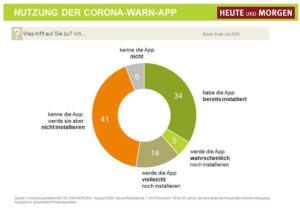 Jeder dritte Bundesbürger ab 18 Jahren (34 Prozent) hat die Corona-Warn-App der Bundesregierung bisher auf seinem Smartphone installiert. Weitere 19 Prozent wollen diese in Zukunft „wahrscheinlich“ (5 Prozent) oder „vielleicht“ (14 Prozent) noch tun, wie eine Umfrage des Marktforschungsunternehmen Heute und Morgen zeigt. Auf der anderen Seite stehen 41 Prozent der Deutschen der Anwendung kritisch gegenüber.
