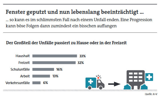 Folgen, die das gesamte Lebensumfeld verändern, werden häufig unterschätzt. Dabei verletzen sich etwa 7 Millionen Bundesbürger jährlich bei Unfällen. Die meisten ereignen sich dabei im Haushalt (33 Prozent) oder in der Freizeit (32 Prozent, siehe auch Grafik Seite 25). Ungefähr eine Million der Unfallopfer haben schwere Folgen zu tragen. Hinzu kommt noch das Risiko, arbeitsunfähig zu werden, das zirka 200.000 Unfallopfer trifft.