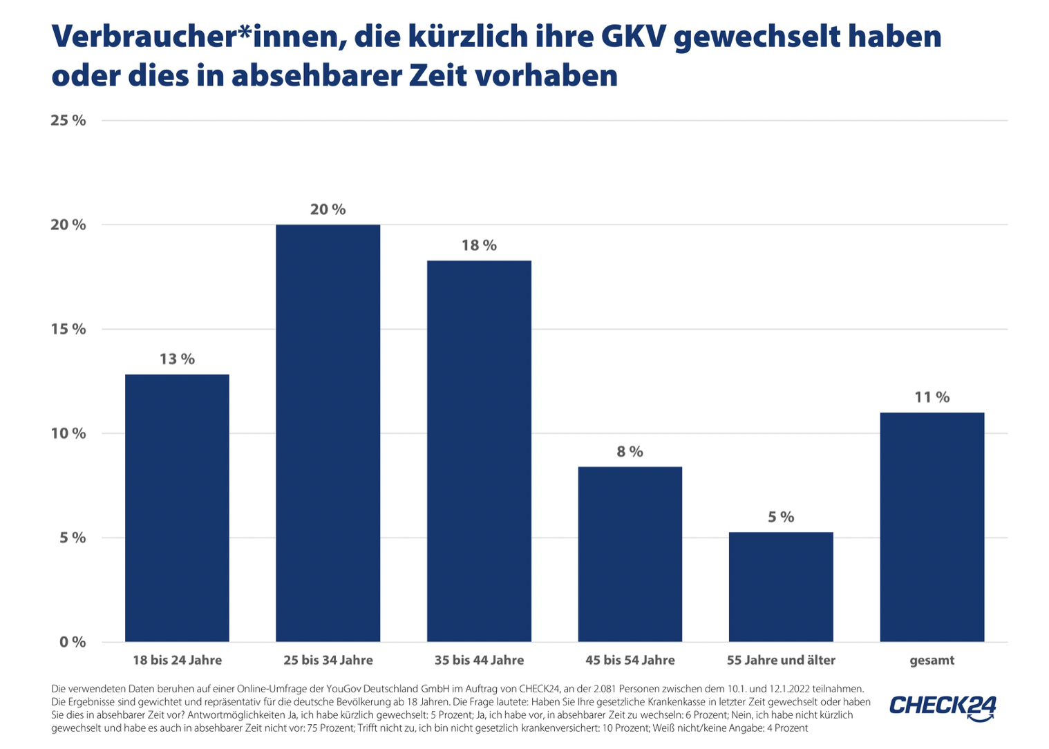 Interessant ist aber: Je jünger die Kunden, desto wechselwilliger sind sie. So gab in der Altersgruppe der 25- bis 34-Jährigen jeder Fünfte an, kürzlich die Kasse gewechselt zu haben oder dies zeitnah tun zu wollen. Insgesamt bleiben damit drei von vier Befragten ihrer Kasse treu. Weitere 14 Prozent der Umfrageteilnehmer sind nicht gesetzlich versichert oder machten keine Angaben.