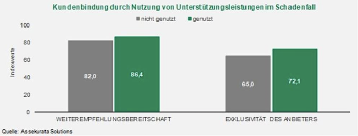 So liegt die Weiterempfehlungsbereitschaft in der Gruppe derer, die bereits einmal Unterstützungsleistungen in Anspruch genommen hat, 4,4 Indexpunkte über der Fraktion, die noch keine Leistungen genutzt hat. Bei der wahrgenommenen Exklusivität des Anbieters beträgt die Differenz sogar 7,1 Indexpunkte. Zudem geben 9 von 10 Kunden an, den Service ihres Versicherers im Schadenfall wieder nutzen zu wollen.