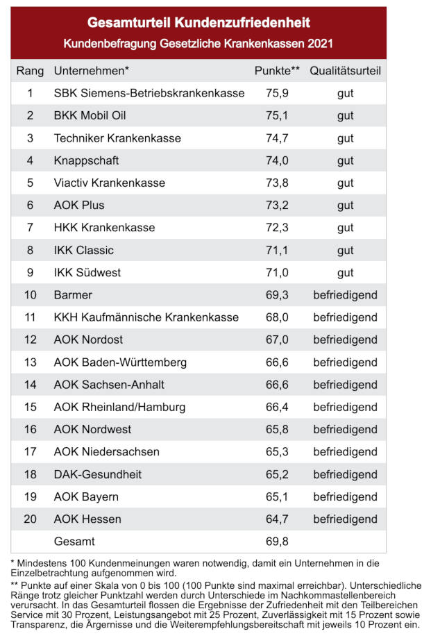 Im Gesamtranking belegt die SBK Siemens-Betriebskrankenkasse den ersten Platz. Den zweiten Rang nimmt die BKK Mobil Oil ein, und auf Platz 3 rangiert die Techniker Krankenkasse (siehe Grafik).