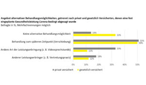 Dagegen wurden nur bei 14 Prozent der privat Versicherten Gesundheitsleistungen ersatzlos gestrichen. Ihnen sei häufiger (18 Prozent gegenüber 12 Prozent) eine Ersatzversorgung durch einen anderen Leistungserbringer angeboten worden. Auch eine andere Art der Leistungserbringung, zum Beispiel durch eine Videosprechstunde, hätten sie eher erhalten als gesetzlich Versicherten (33 Prozent gegenüber 11 Prozent).