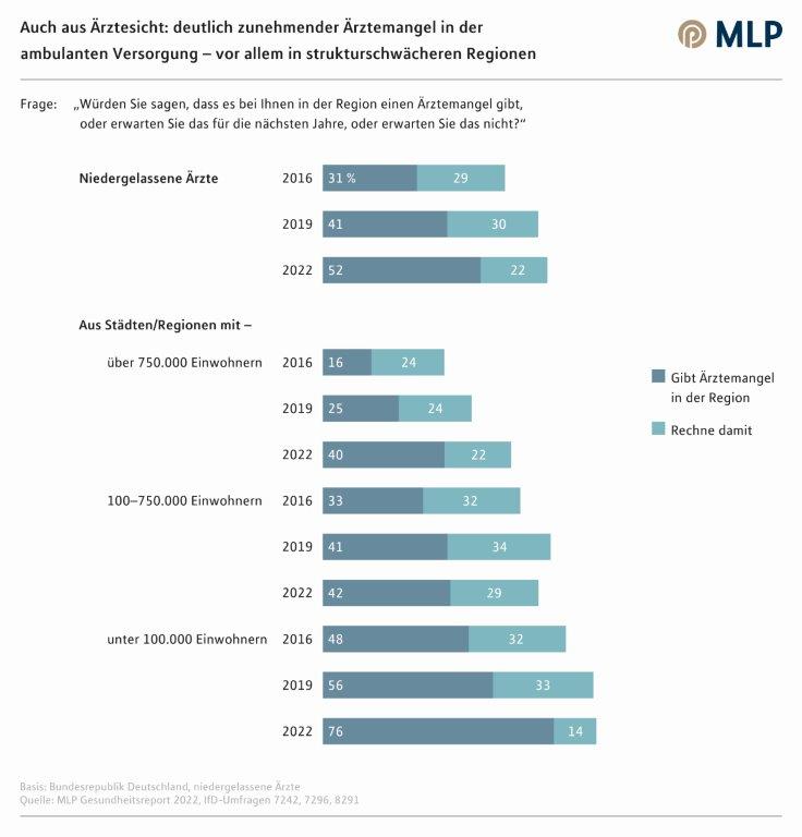 Das könnte tatsächlich insbesondere deshalb eintreten, weil Ärzte knapper werden, vor allem in sogenannten strukturschwachen Regionen. Gut jeder dritte Befragte nimmt in der eigenen Wohngegend schon einen Mangel an Ärzten wahr. In Städten oder Regionen unter 100.000 Einwohnern sind es sogar 47 Prozent.