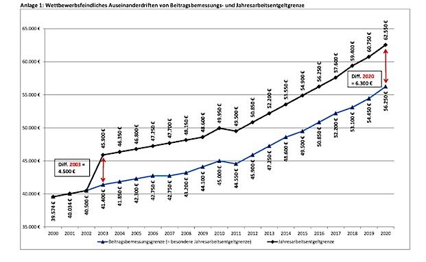 „Danach würden beide Grenzen wieder entsprechend der Bruttolohnentwicklung jährlich angepasst werden. Dieser sanfte Prozess der Wiederangleichung von BBG und JAEG würde bei einer angenommenen Lohnentwicklung von durchschnittlich 2 Prozent pro Jahr in etwa sechs bis sieben Jahre dauern. Mit beiden Optionen würde auch die parallele Existenz von einer allgemeinen und einer besonderen JAEG behoben“, rechnet der Verband vor.
