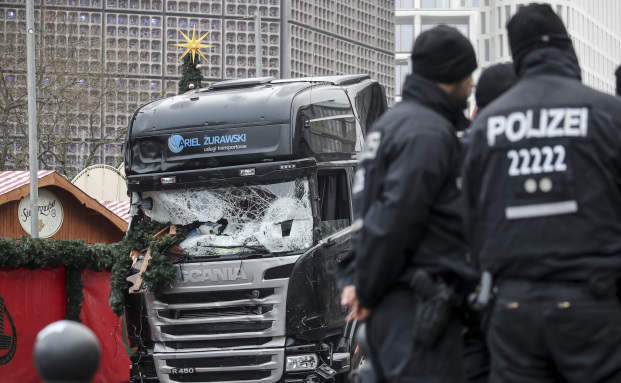 Polizisten stehen vor dem zerstörten LKW am 20. Dezember 2016 am Weihnachtsmarkt am Breitscheidplatz in Berlin: Bei dem Terroranschlag starben zwölf Menschen auf dem Weihnachtsmarkt.