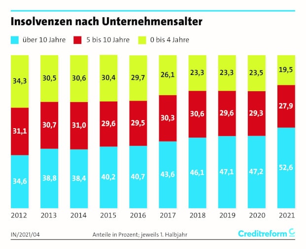 Interessant: Mehr als jedes zweite Unternehmen, das im 1. Halbjahr Insolvenz anmelden musste, war bereits zehn Jahre oder älter. „Damit setzt sich der Trend fort, wonach für viele Insolvenzkandidaten das Aus nicht als junges, sonders erst als etabliertes Unternehmen kommt“, so die Creditreform-Analysten (siehe Grafik).