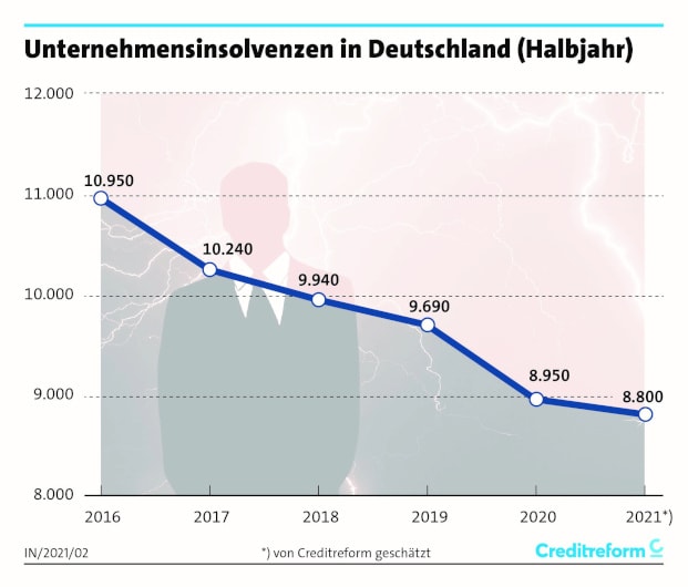 Die vielfach prognostizierte große Corona-Pleitewelle zeichnet sind für Deutschland vorerst noch nicht ab. Im Gegenteil: Auch im 1. Halbjahr 2021 gingen die Firmenpleiten weiterhin zurück, wie Berechnungen der Wirtschaftsauskunftei Creditreform zeigen. Allerdings würden die Zahlen „deutlich durch Sondereffekte verzerrt“, geben die Bonitäts-Analysten zu bedenken.