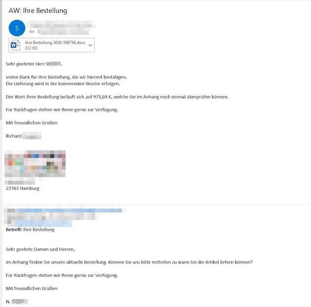 Am Freitagvormittag erhält das Unternehmen die Bestätigung des Bürodienstleisters, dass die Ware im Wert von 973,84 Euro in der kommenden Woche geliefert wird. Was ist der erste Impuls von vielen Nutzern, wenn diese eine Bestätigung über 973,84 Euro erhalten, statt der tatsächlich bestellten 126,34 Euro? Unter der Mail ist die Originalmail vom Donnerstag (siehe Screenshot). Viele Nutzer klicken in diesem Moment auf den Anhang, um zu prüfen, was da schiefgelaufen ist und infizieren dadurch ihr eigenes Unternehmen.
