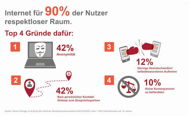 Über 90 Prozent der Bundesbürger sind heutzutage online unterwegs. Dabei wird der Umgangston aber immer rauer. Fast jeder Internetnutzer (90 Prozent) findet, dass Menschen im Netz respektloser miteinander umgehen, als im persönlichen Austausch. Das zeigt eine aktuelle Umfrage von Generali und Advocard.