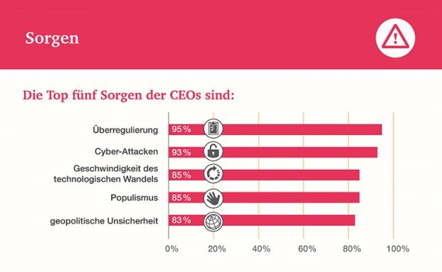 Die Versicherungsbranche fürchtet die möglichen negativen Folgen der Digitalisierung. 53 Prozent der Verantwortlichen geben an, „äußert besorgt“ wegen drohender Cyber-Attacken zu sein. 51 Prozent sehen die Geschwindigkeit des digitalen Wandels skeptisch. Zu diesen Ergebnissen kommt der „CEO Survey“ des Beratungsunternehmens Pricewaterhouse Coopers (PWC), für welchen Marktforscher 100 Führungskräfte befragt haben.