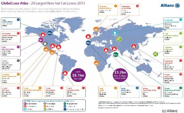 Gestützt auf die Daten der Gesamtbranche für 2013 belaufen sich die zwanzig größten gemeldeten Schäden im kompletten Versicherungssektor auf etwa 5,9 Milliarden Euro, wobei Schäden durch Naturkatastrophen nicht einbezogen sind. Schadenereignisse in der Öl- und Gasindustrie dominieren 2013 bei den größten Schäden mit 40 Prozent der Gesamtsumme. Feuer und/oder Explosion sind für 8 der 20 wichtigsten Schäden beziehungsweise mit etwa 2,9 Milliarden Euro für fast die Hälfte der Gesamtschadenrechnung verantwortlich.