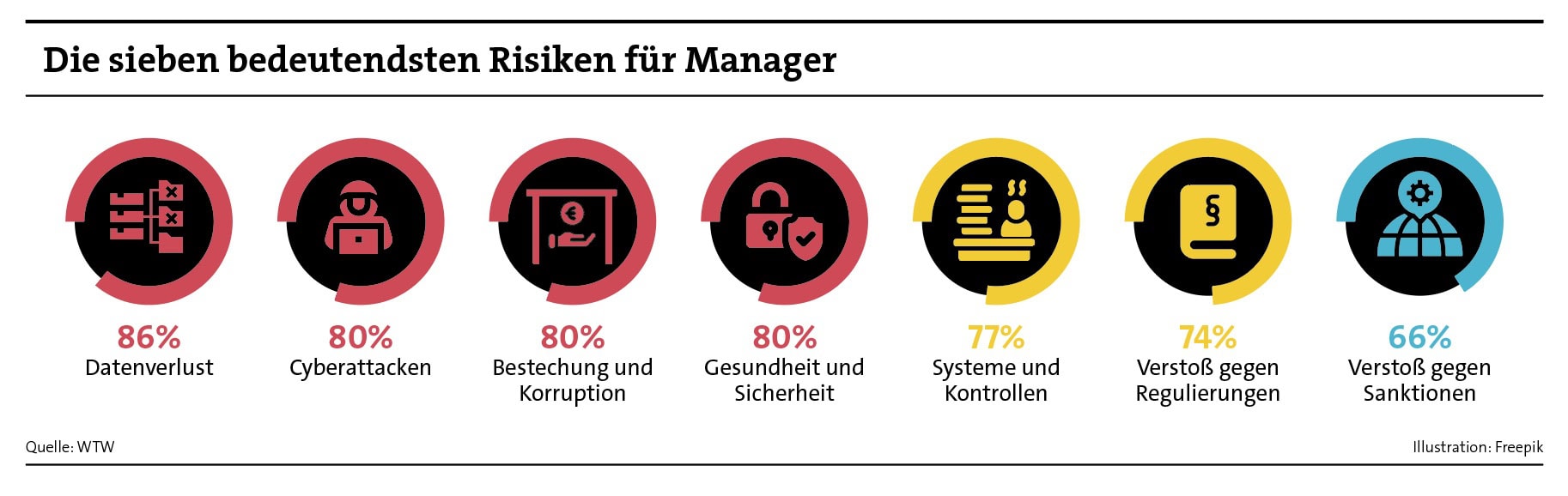 Die Gemengelage für viele Unternehmen ist angesichts der verschiedenen Risiken aktuell nicht einfach. Und das macht auch den Managern das Leben schwer, da ihr Haftungsrisiko steigt. Das Beratungsunternehmen WTW (früher Willis Towers Watson) hat zusammen mit der internationalen Anwaltssozietät Clyde & Co. ausgewertet, was Manager in Deutschland und international aktuell beschäftigt. Für die Umfrage wurden weltweit 662 Vorstände, Geschäftsführer und Risikomanager befragt.