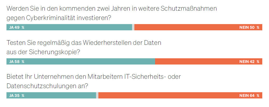 Ebenfalls nicht sonderlich stark ausgeprägt sind die organisatorischen Maßnahmen für den Ernstfall. So ist jeder zweite Mittelständler auf einen erfolgreichen Hacker-Angriff nicht vorbereitet. Nur ein Drittel sensibilisiert und schult die Belegschaft für den Umgang mit IT-Risiken.