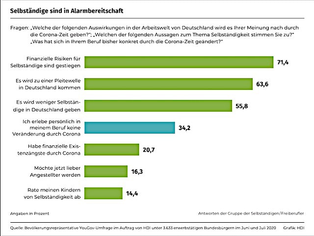 Fast die Hälfte aller Berufstätigen in Deutschland befürchtet, dass es durch die Corona-Krise zu einem Schwund an Selbstständigen kommen wird. Und diese Sorge ist auch nicht ganz unberechtigt. So wollen 38 Prozent der Angestellten, die vor Corona Pläne für eine berufliche Selbständigkeit hatten, diese jetzt nicht mehr weiterverfolgen. Und fast jeder sechste Selbstständige gibt an, dass er bei passender Gelegenheit „jetzt lieber in ein Angestelltenverhältnis wechseln möchte, wenn ich die Gelegenheit hätte“.