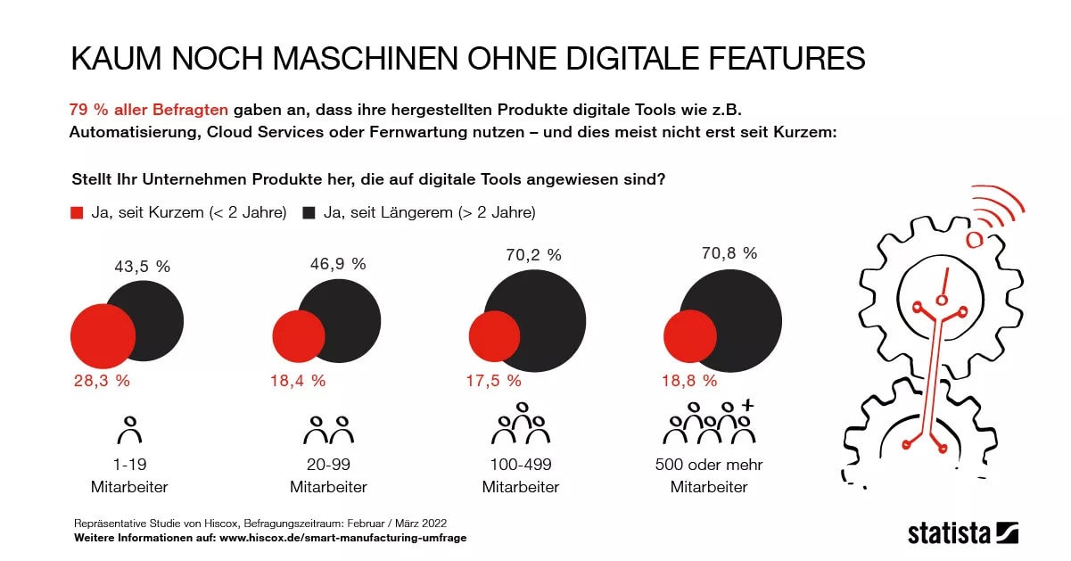 Anlagen- und Maschinenbau in Deutschland ist längst nicht mehr so analog, wie man vielleicht meinen mag. Nur noch jedes fünfte Unternehmen aus der Branche kommt noch vollständig ohne digitale Techniken wie Automatisierung, Cloud Services oder Fernwartung aus. Bei großen Unternehmen ab 500 Mitarbeitern ist es gar nur noch jedes zehnte.