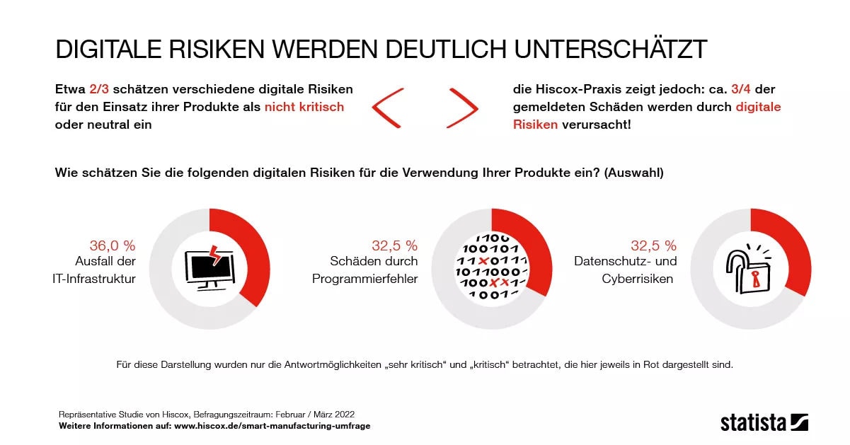 Die Befragten sehen durchaus die Schattenseiten der Digitaltechnik. 62 Prozent räumen ein, dass Risiken dadurch gestiegen sind. Lediglich 17 Prozent meinen, dass Risiken eher gesunken sind. Eine Ansicht, die Hiscox nicht bestätigen will. Laut der dortigen Schadenpraxis entstehen drei Viertel aller Schäden aus digitalen Risiken, wie der Versicherer mitteilt.