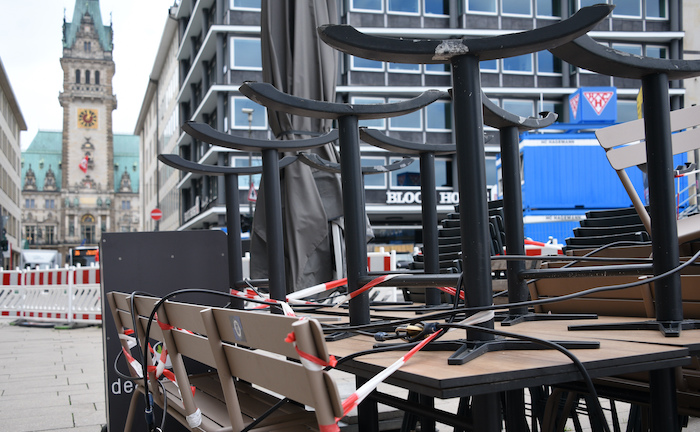 Hamburg Anfang Mai: Abgesperrte Tische und Stühle stehen vor einem Lokal. Im Hintergrund ist das Rathaus zu sehen.