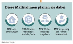 33 Prozent der Mittelständler sehen wegen des Arbeitskräftemangels mittel- bis langfristig sogar ihre Existenz in Gefahr. Besonders kleine Unternehmen äußern diese Sorge. Um dem zunehmenden Arbeitskräftemangel entgegenzutreten, wollen fast acht von zehn Unternehmen, die in den kommenden fünf Jahren mit Problemen bei der Stellenbesetzung rechnen, ihre Arbeitgeberattraktivität steigern.