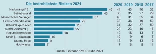 Auf Platz zwei und drei der Risiko-Szenarien folgen Betriebsausfälle (43 Prozent) und menschliches Versagen (37 Prozent), also alles Dinge, die den Betrieb eines Unternehmens zum Stillstand bringen können. Immer weniger fürchten KMU dagegen greifbare Gefahren wie Einbrüche oder Brände.