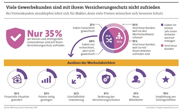 Es bieten sich also einige Chancen – allein aus dem Marktvolumen. Zusätzlich sind viele Betriebe, unabhängig von ihrem Geschäftsmodell, oft nicht passend versichert. Oder ihr Versicherungsschutz ist schon einige Jahre alt und wurde seither nie aktualisiert. Rund ein Drittel der Gewerbekunden zeigt sich daher mit dem aktuellen Versicherungsschutz unzufrieden.