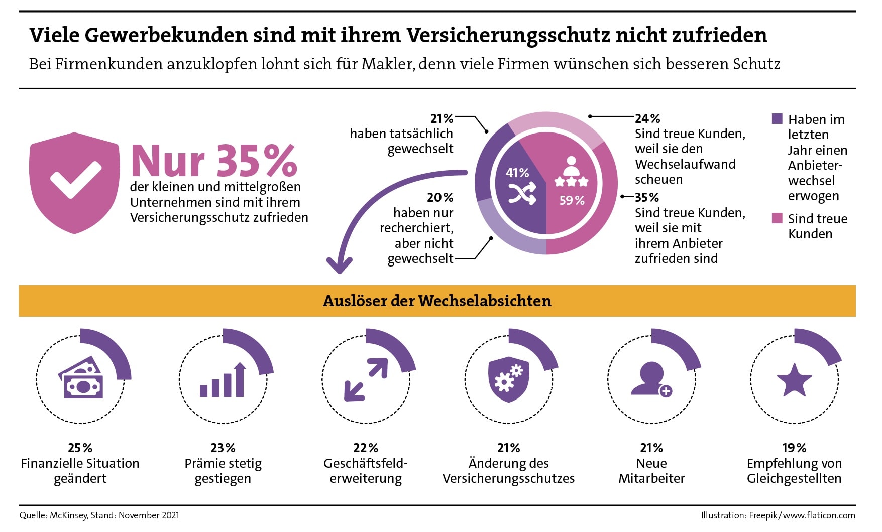 Es bieten sich also einige Chancen – allein aus dem Marktvolumen. Zusätzlich sind viele Betriebe, unabhängig von ihrem Geschäftsmodell, oft nicht passend versichert. Oder ihr Versicherungsschutz ist schon einige Jahre alt und wurde seither nie aktualisiert. Rund ein Drittel der Gewerbekunden zeigt sich daher mit dem aktuellen Versicherungsschutz unzufrieden.