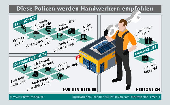 Grundsätzlich birgt handwerkliche Arbeit ein höheres Gefahrenpotenzial als beispielsweise ein Bürojob. „Darum brauchen Handwerker maßgeschneiderten Versicherungsschutz“, sagt Mike Görn, Geschäftsführer des Maklerunternehmens HandwerkSchafft.de. Welche Police notwendig sei, hänge von den persönlichen Präferenzen des Handwerkers, vor allem aber von den zu schützenden Werten im Betrieb ab. Einige Versicherungen zählen jedoch unabhängig davon zum Handwerker-Basisschutz.