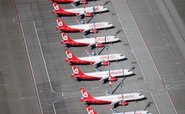 Flugzeuge der insolventen Fluggesellschaft Air Berlin stehen im Oktober 2017 auf dem Vorfeld des Hauptstadtflughafens BER in Schönefeld, Brandenburg.