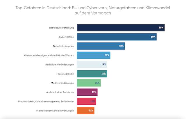 In Deutschland ist die Angst vor Betriebsunterbrechungen stärker ausgeprägt. Nichts anderes fürchten Unternehmen hierzulande mehr (55 Prozent). Auf Platz 2 folgen dann die Cyber-Vorfälle (50 Prozent) und auf Platz 3 die Naturkatastrophen (30 Prozent).