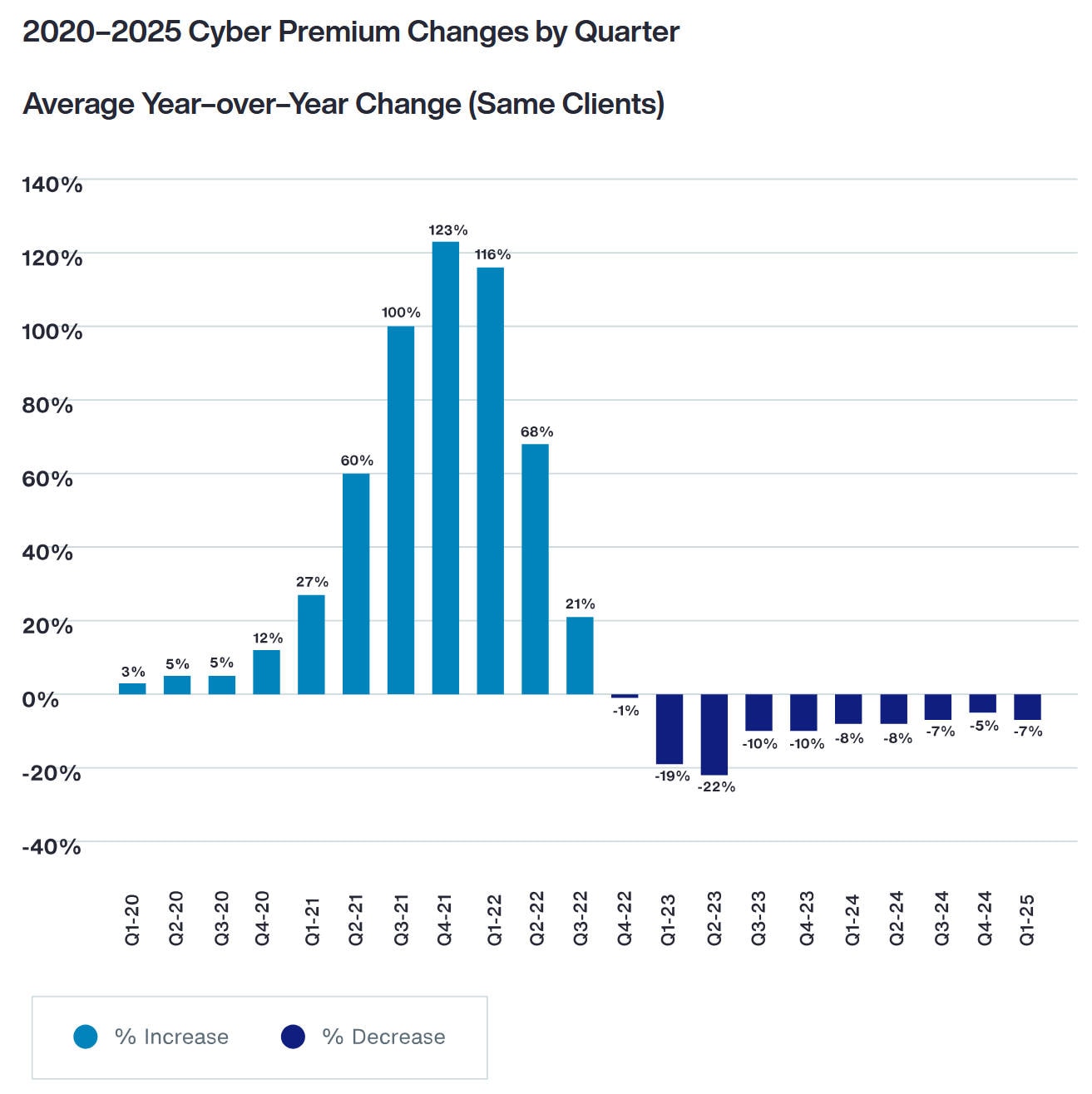Genau das ist der Grund, weshalb die Prämien für Cyberversicherungen trotz des Trommelfeuers der Hacker gleichbleiben oder sogar sinken. Für das erste Quartal 2025 verzeichnete Aon um 7 Prozent gesunkene Prämien. Auch davor ging es schon abwärts, wie die folgende Grafik zeigt.
