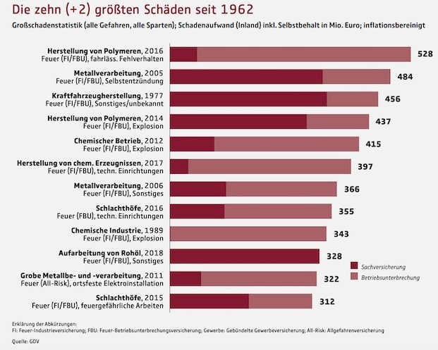 Welcher (oder welche) Versicherer für den Schaden aufkäme ist folglich ebenso noch unklar. Sofern das Unternehmen aber tatsächlich umfassend versichert ist, so wäre dies ein Fall für die industrielle Feuerversicherung sowie die Betriebsunterbrechungsversicherung. Zugleich wirft der Vorfall die Frage auf, wie häufig derartige Großschäden die Bilanzen der deutschen Versicherungswirtschaft belasten?