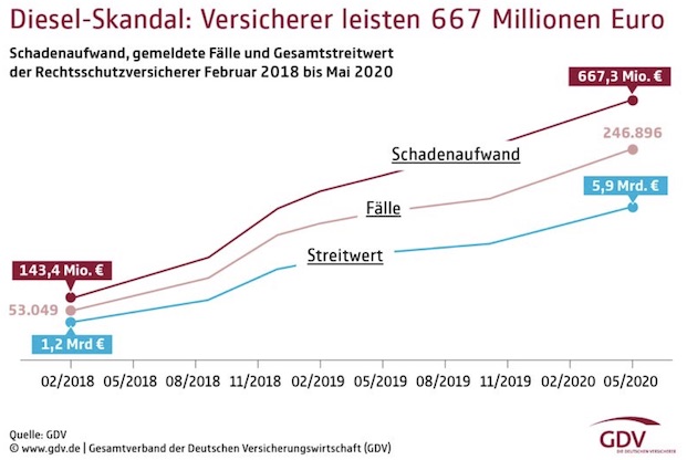 Bis Ende Mai sind laut GDV rund 667 Millionen Euro für Anwalts-, Gerichts- und Gutachterkosten angefallen. Der Abgasskandal nahm vor gut fünf Jahren seinen Anfang und gipfelte vor einigen Wochen in dem Abschluss der Musterfeststellungsklage gegen Volkswagen.