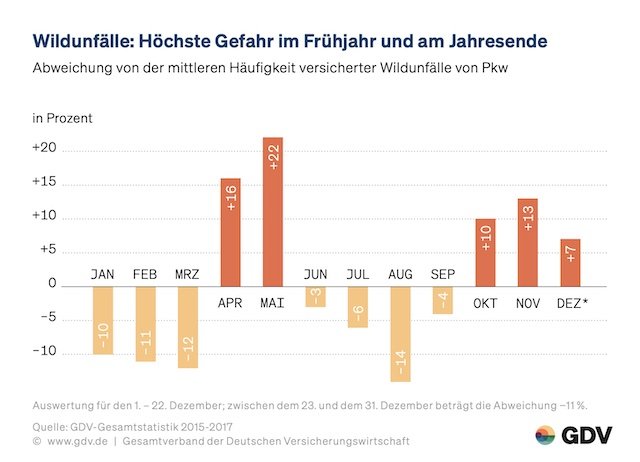 „Gedrosselte Geschwindigkeit und Wachsamkeit verringern den Anhalteweg sowie die Wucht, mit der über die Straße springendes Wild in den Pkw einschlägt“, sagt die stellvertretende GDV-Hauptgeschäftsführerin Anja Käfer-Rohrbach. Fahrer sollten abblenden und bremsen, wenn sie Wildtiere auf der Straße sehen. Mit der Hupe könnten die Tiere in der Regel verscheucht werden.