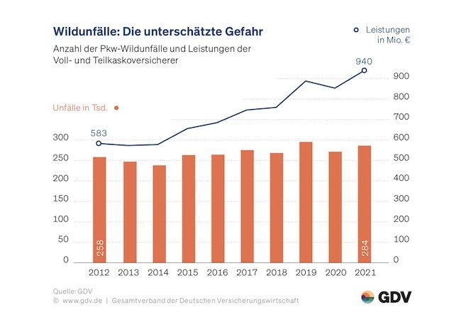 Im Jahr 2021 zählten die deutschen KFZ-Versicherer rund 284.000 Wildunfälle mit kaskoversicherten Autos. Dabei entstanden Schäden in Höhe von 940 Millionen Euro – mehr als 3.300 Euro pro Unfall.