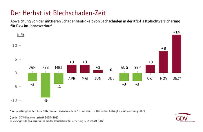 Immerhin: Nach Weihnachten scheinen sich die Menschen meist an die winterlichen Straßenbedingungen gewöhnt zu haben. Gleichzeitig sinkt auch die Zahl der Verletzten zwischen Dezember und März im Vergleich zum Jahresdurchschnitt. Hier liegt der Schwerpunkt laut GDV in den Monaten April bis August.