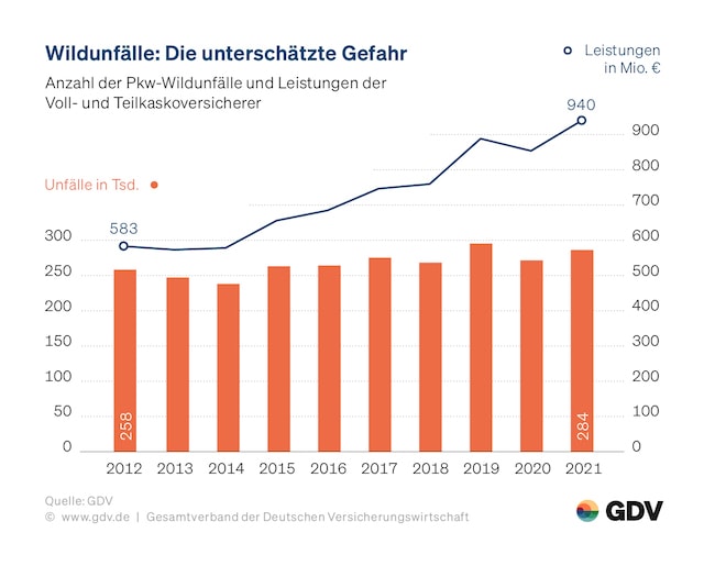 „Die deutschen Autoversicherer haben für rund 284.000 Wildunfälle mehr als 940 Millionen Euro gezahlt“, vermeldete kürzlich Jörg Asmussen, Hauptgeschäftsführer des Gesamtverbands der Deutschen Versicherungswirtschaft (GDV). Rein rechnerisch seien es damit täglich fast 800 gewesen.