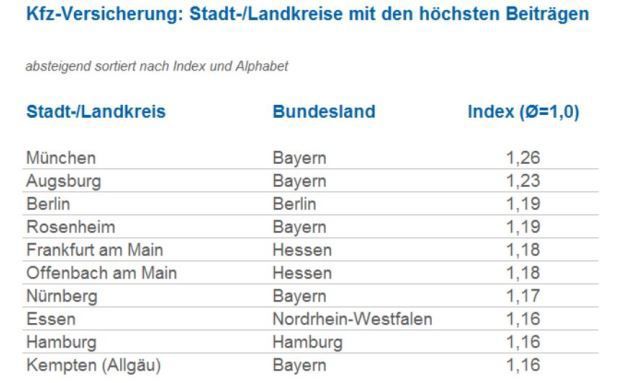 In Augsburg und München sind es demnach 23 beziehungsweise 26 Prozent mehr als im Bundesdurchschnitt (siehe Grafik). Auch in Rosenheim und Nürnberg fallen die Prämien besonders hoch aus. Gleiches gilt für die größten deutschen Städte Berlin und Hamburg sowie für Frankfurt und Offenbach.